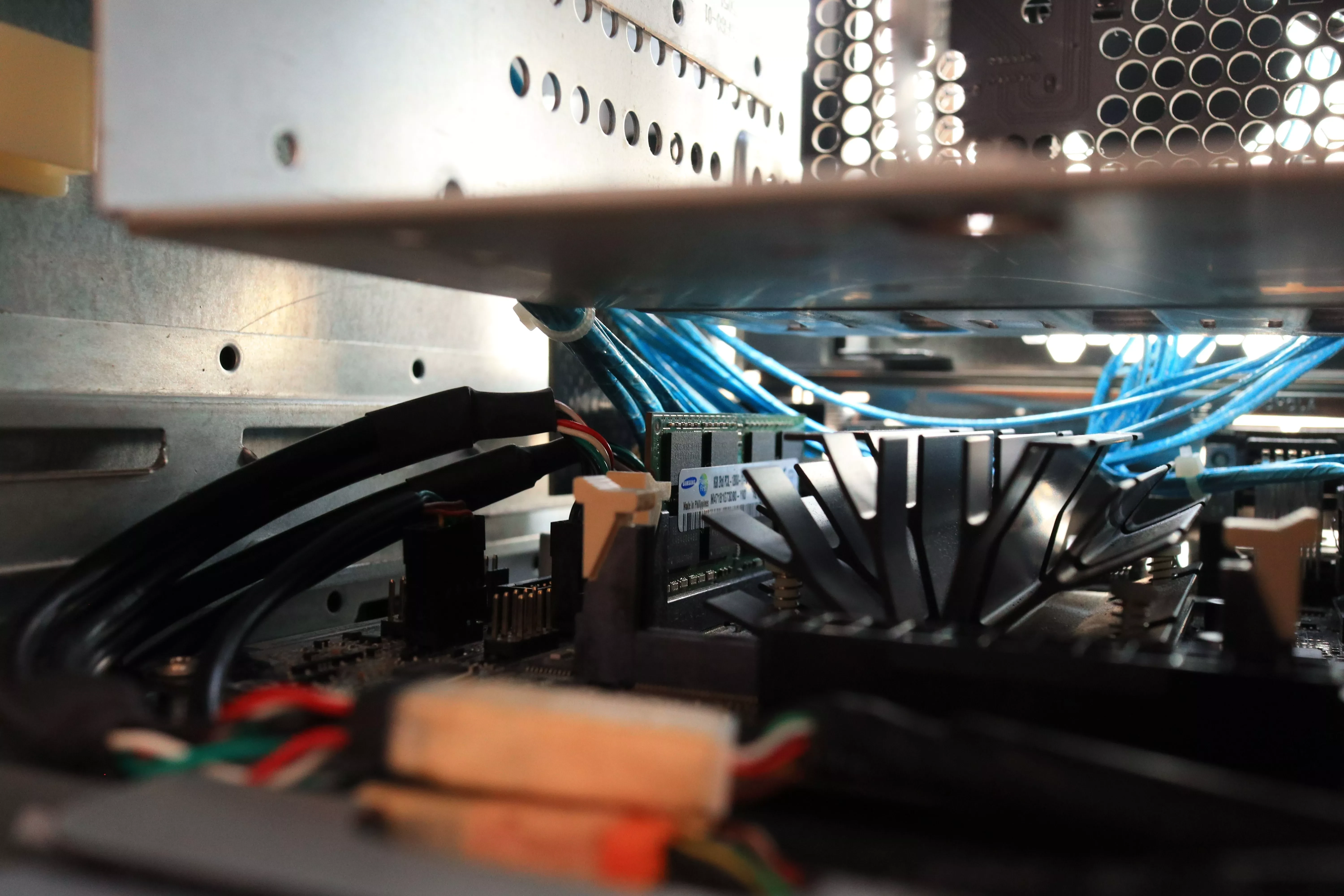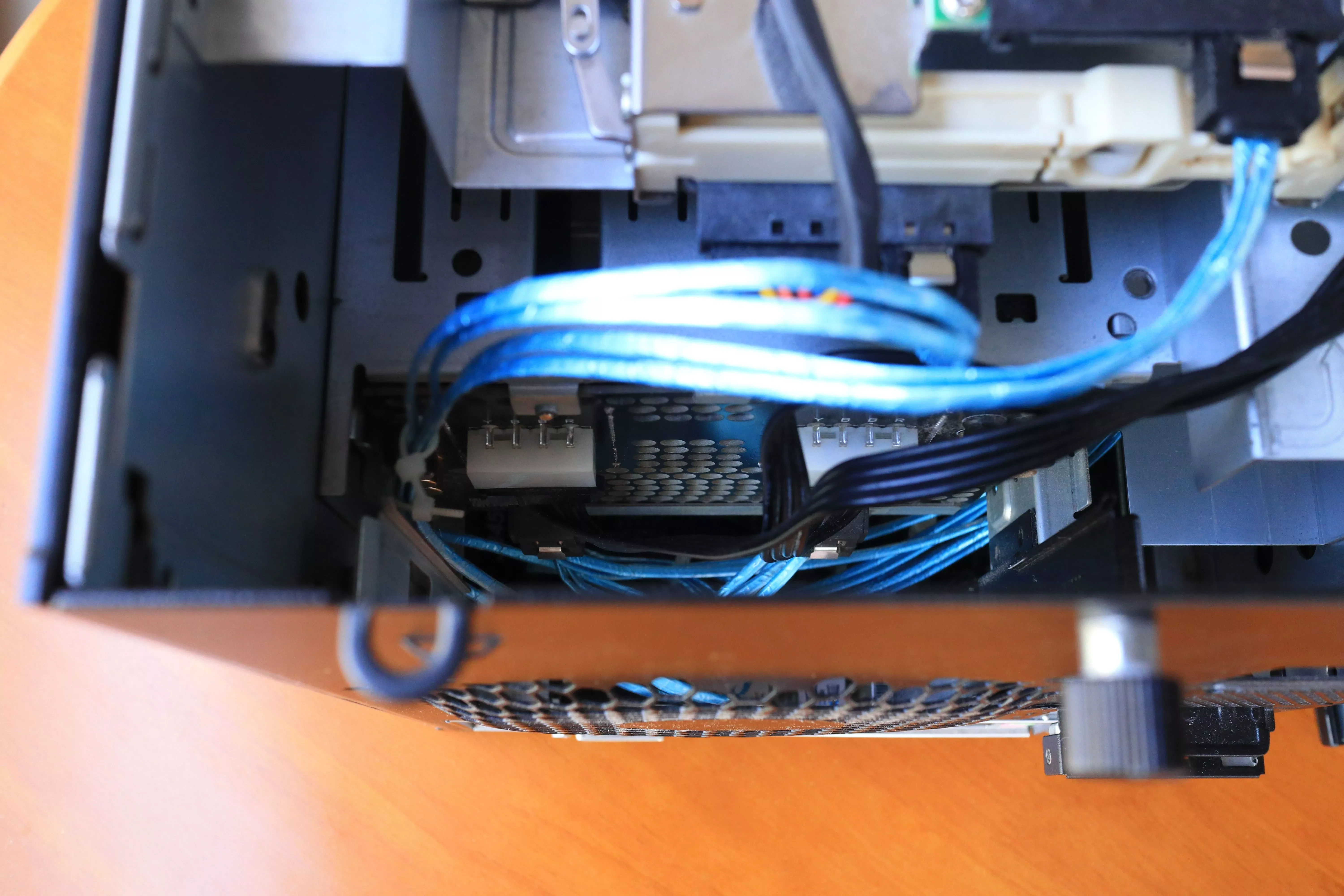 左侧PCIE位的空间和导轨,位置十分狭小,改用了铝箔的SATA线
